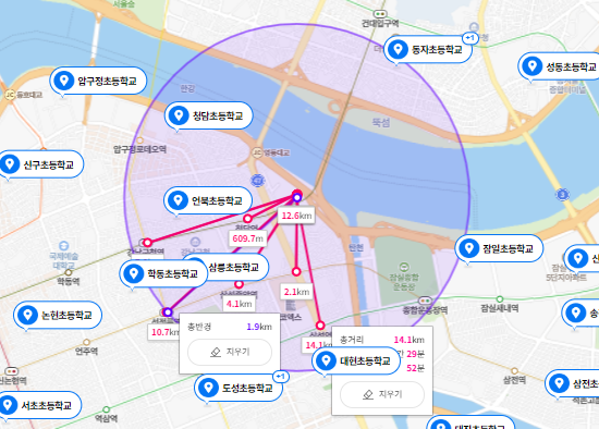 초등학생의 특성상 반경 1KM로 거리를 잡아 봤을 때 4~5개 정도의 초등학교가 위치합니다.