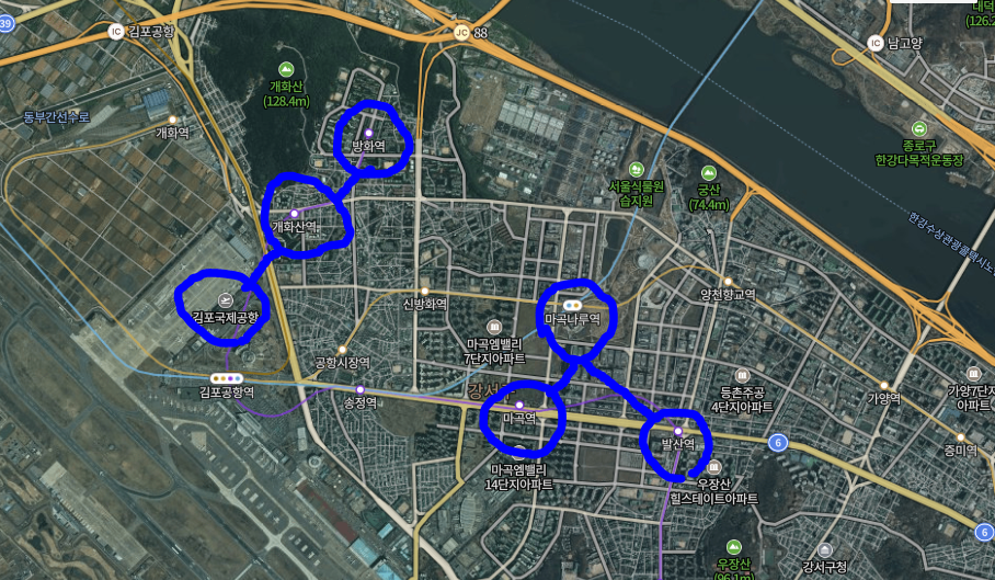지도를 봤을때 신방화역, 공항시장역, 마곡나루역, 트리플역세권 입지이며.