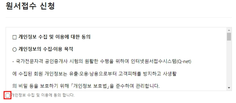 원서접수를 눌러서 들어가셨다면 다음과 같이 원서접수 개인정보 동의 처리가 나온다면 모두 동의함으로 해줍니다.