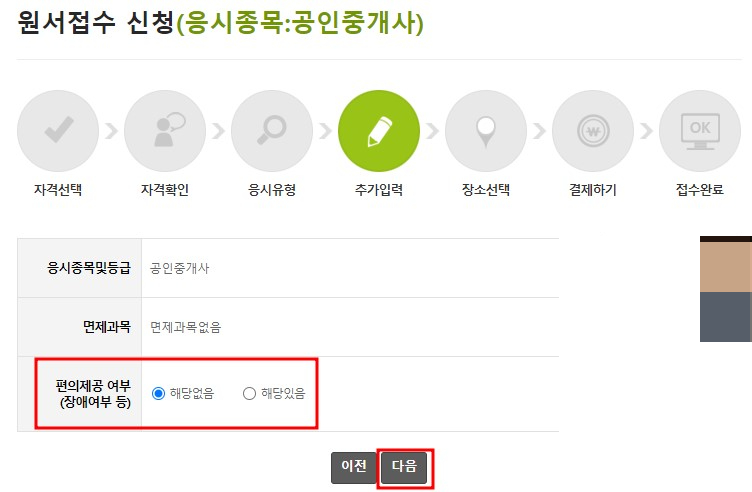 비장애인이시라면 편의제공여부 없음에 장애인이시라면 있음에 눌러줍니다. 그 후