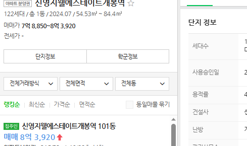 2024년 입주예정인 개봉역 신영지웰에스테이트 실거래가는 현재 8억까지 육박합니다.