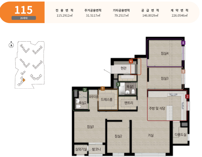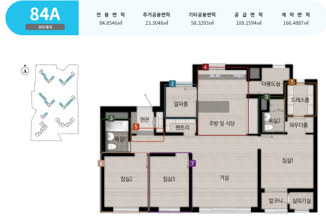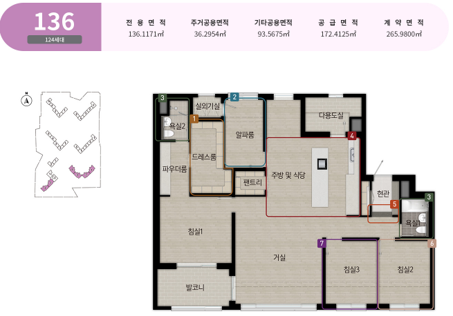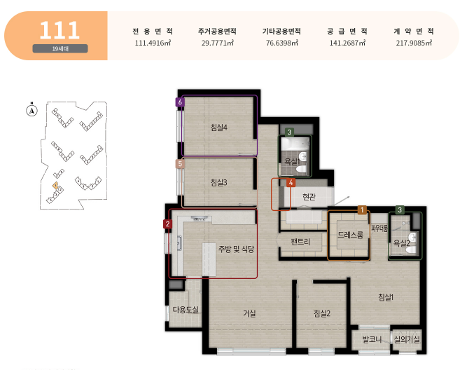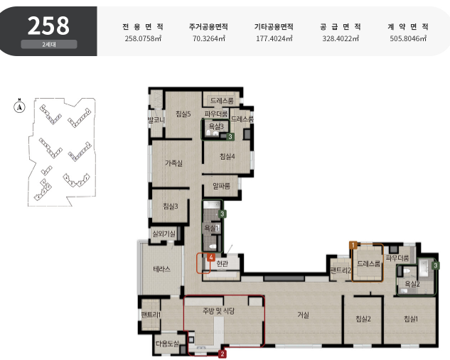| 전용면적 | 84.8546㎡ | 84.6905㎡ | 111.4916㎡ | 115.2912㎡ | 136.1171㎡ | 258.0758㎡ |