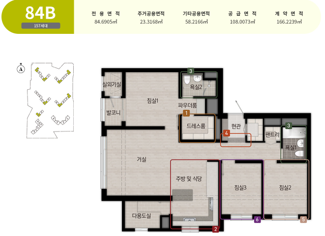 전용면적 | 84.8546㎡ | 84.6905㎡ | 111.4916㎡ | 115.2912㎡ | 136.1171㎡ | 258.0758㎡ |