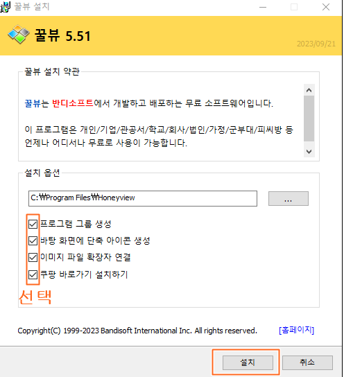 꿀뷰 설치 약관이 보일 것입니다. 설치약관을 한번 읽어보고 설치약관에 아무 문제가 없다면 설치 옵션 밑에 있는 옵션들을 모두 선택 해주고 설치를 눌러 주세요.