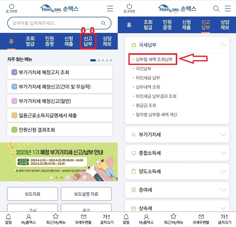 다음은 손택스로 어떻게 납부하는지 방법 알아보겠습니다. 손택스는 홈택스의 모바일버전 이라고 생각해주시면 편합니다.