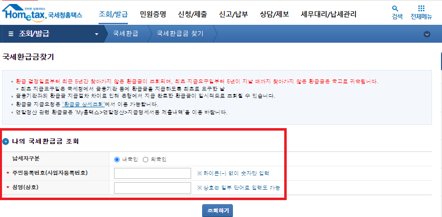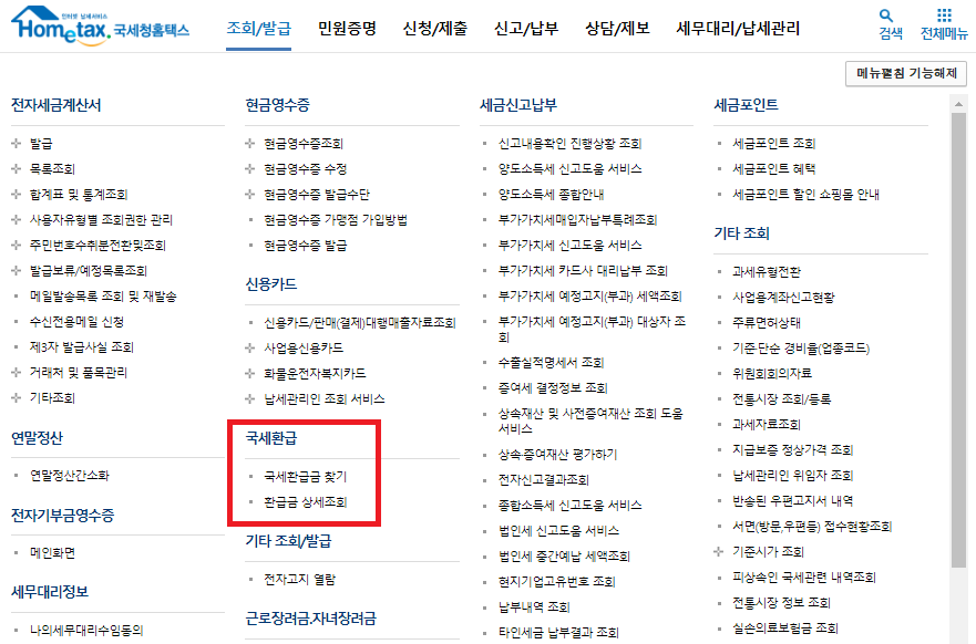 부가가치세 환급금을 조회하려면 모든 세금납부의 사이트인 홈택스에 접속을 해주셔야합니다. 조회/발급 - 국세환급 - 환급금 상세조회 순으로 진행됩니다. 밑에 사진처럼 홈택스 브라우저를 키고 좌측상단 조회 / 발급을 보면 국세환급을 들어가셔서 로그인 하고 환급금 조회 하시면 되겠습니다.