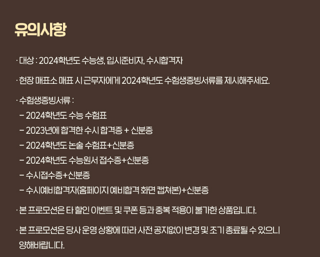 👉인증방법 : 2024 수학능력시험 수험표/접수증/수시 합격증 원본+ 사진이 부착된 신분증(학생증,청소년증)