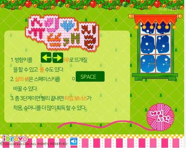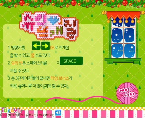 슈의 뜨개질은 방향키를 이용하여 슈를 움직일 수 있고, 스페이스바를 눌러 털실을 놓습니다.