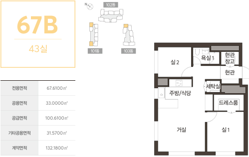 | 전용면적 | 67.9400 | 67.6100 | 77.2900 | 84.9800 | 84.9800 | 84.9400 | 84.9400 |