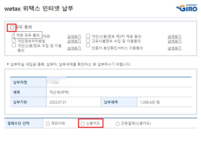 조회된 세금 정보를 확인한 후 결제 진행 (카드, 계좌이체, 간편결제 등)