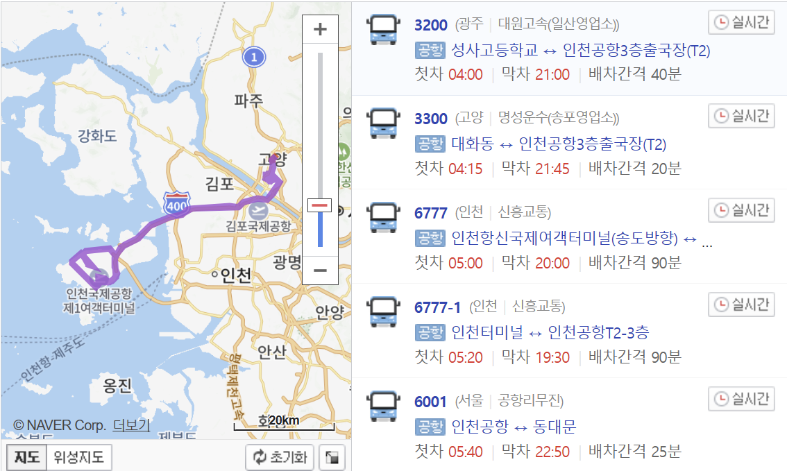 출발지를 선택하고, 인천공항 제1터미널 또는 제2터미널을 목적지로 설정하세요.