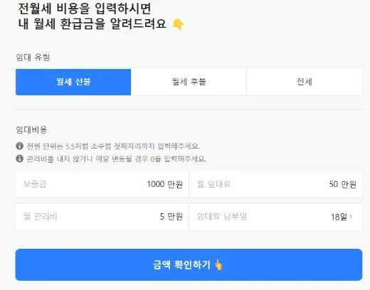 - 어플을 들어간 후 임대유형, 임대비용, 보증금, 월임대로, 월관리비, 임대로 납부일 입력한다