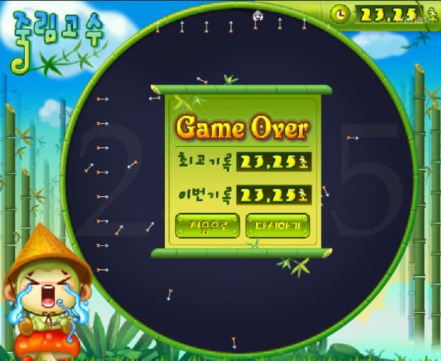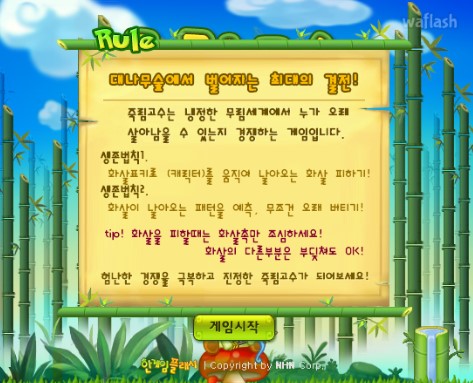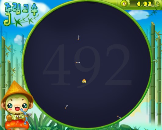 죽림고수를 하는 방법은 화살표키로 캐릭터를 움직여서 날아오는 화살을 피해주면 됩니다. 즉 , 마우스를 이용하여 캐릭터를 움직일 수 있습니다.
