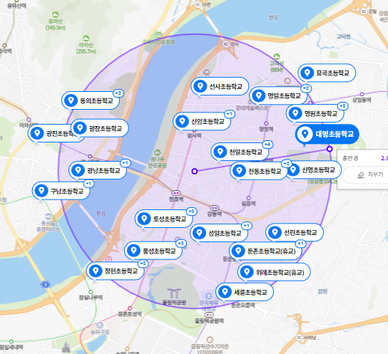 사진은 반경 2KM 내에 있는 초등학교입니다. 최소 350M ~ 2KM까지 10개가 넘는 학군으로