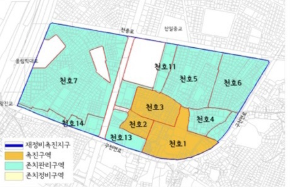 강동구 천호뉴타운은 1 구역 ~ 7 구역까지 차례대로 개발 계획이며
