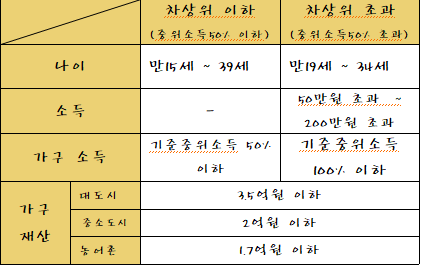 ※ 단, 수급자·차상위자·기준 중위소득 50% 이하자는 만 15세~만 39세까지 허용- (근로·사업소득) 기준중위소득 50% 초과~100% 이하일 경우 근로 사업소득이 월 50만원 초과 ~ 월 200만원 이하
