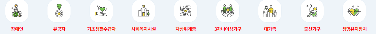 ✅ 유공자 : 국가유공자("국가유공자등예우 및 지원에 관한 법률"에 의한 1~3급 상이자), 상이유공자("5.18민주유공자예우에 관한 법률"에 의한 1~3급 상이자), 독립유공자("독립유공자 예우에 관한 법률"에 의한 독립유공자 또는 독립유공자의 권리를