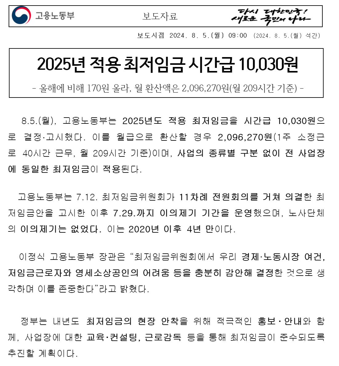 2025년 대한민국의 최저시급은 시간당 10,030원으로 결정되었습니다. 이는 2024년의 9,860원에서 170원(1.7%) 인상된 금액으로, 최저임금이 처음으로 1만 원을 넘었습니다.