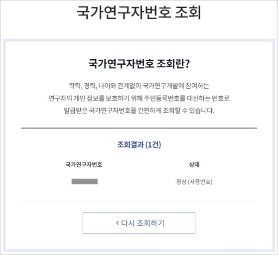 - 이미 과학기술인등록번호(NTIS)나 연구자등록번호(KRI)를 보유하고 계신 경우, 해당 번호가 국가연구자번호로 통합되어 동일하게 사용됩니다.